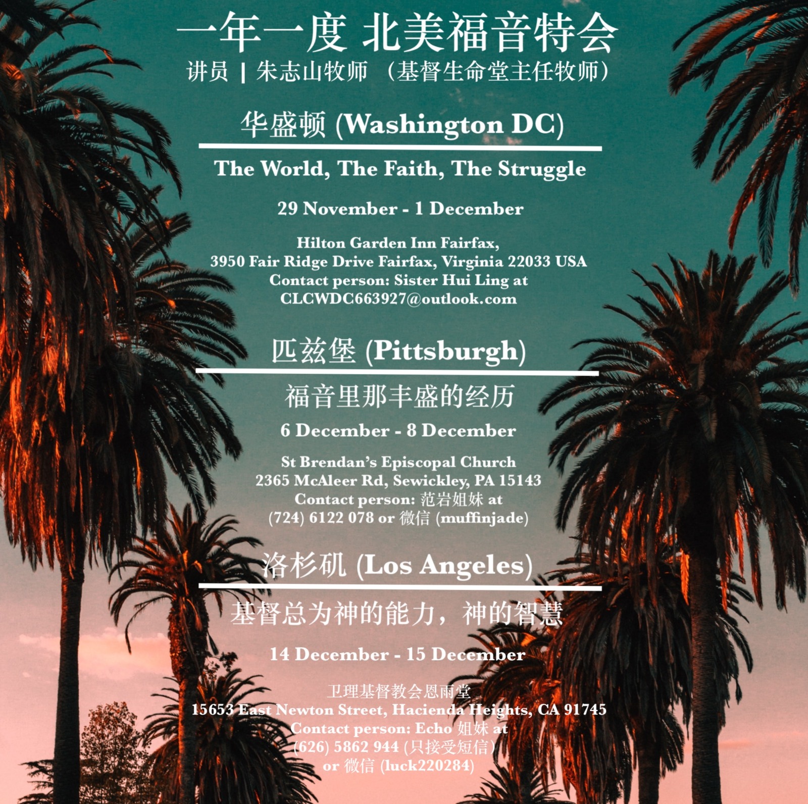 亲爱的弟兄姐妹,新加坡基督生命堂在12月6-8日将全球现场直播【匹兹堡特会】。